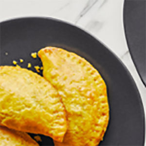 - 5. Place a rack in lower third of oven; preheat to 375°. Lightly flour a rolling pin. Cut dough in half on a lightly floured work surface. Working with one half at a time, roll dough to ⅛" thick. Cut dough with 5" round pastry cutter. Place 2 Tbsp. meat filling on one-half of each round, leaving a ½" border. Brush edges of dough with water. Fold dough over filling to make a half-moon shape. Press edges with the tines of a fork to seal. Repeat process with remaining dough and filling, rerolling scraps as needed. Transfer patties to a parchment-lined baking sheet.
